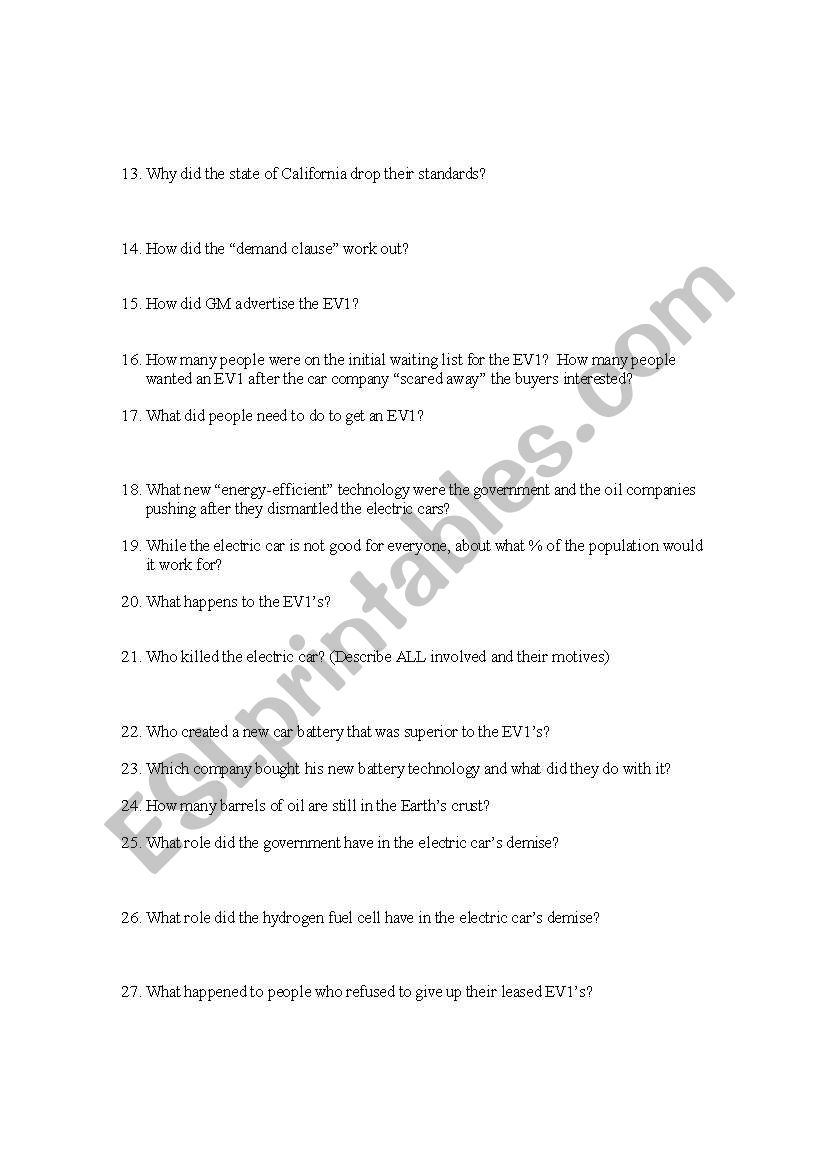 English Worksheets Who Killed The Electric Car Video Worksheet